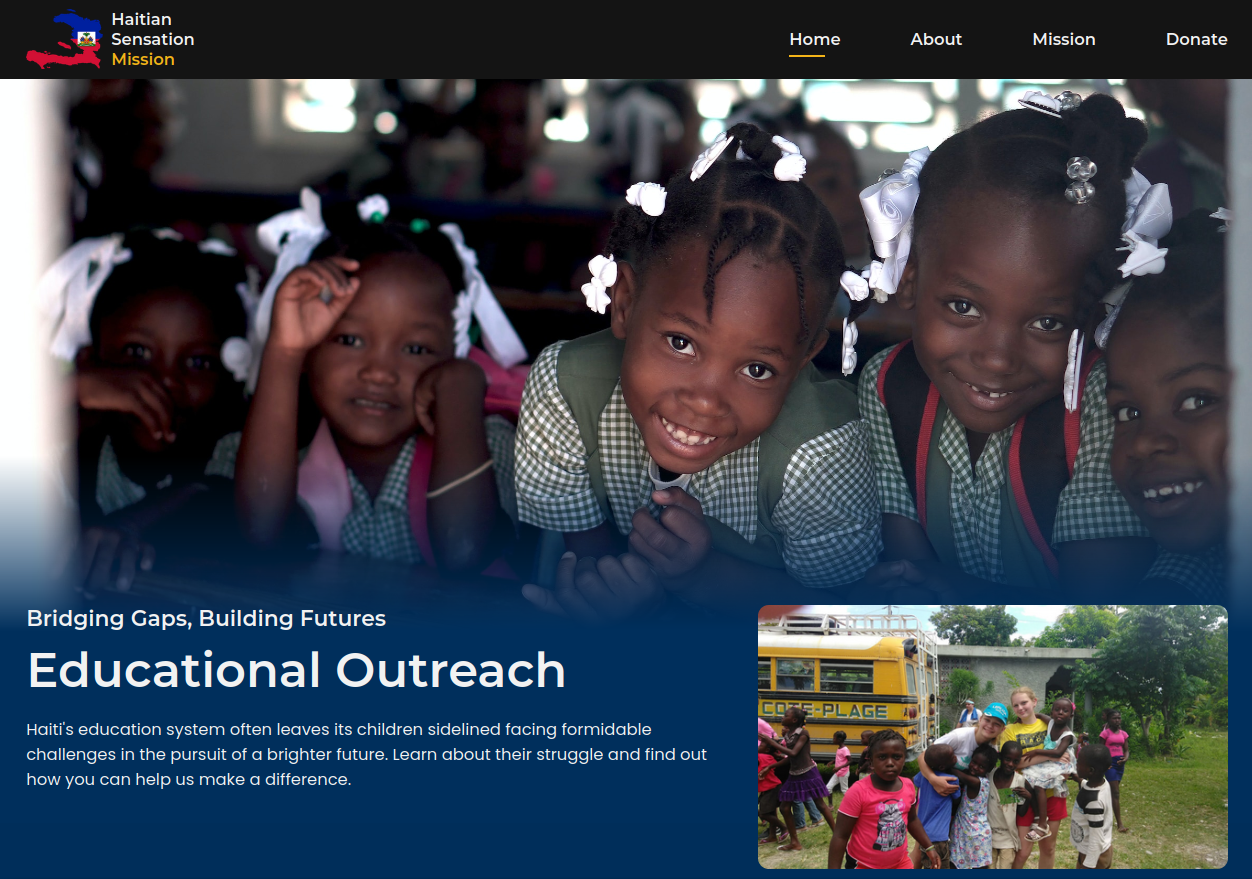 Haitian Sensation Mission is a non-profit donation platform that blends the sophisticated aesthetics of SASS with the seamless functionality of Vanilla JavaScript. Crafted to showcase powerful mission trip photos, the website guarantees transparent donation processing through the Zeffy platform. Visitors can explore a variety of articles, statistics, and moving narratives that shed light on the daily lives and experiences of the Haitian people.